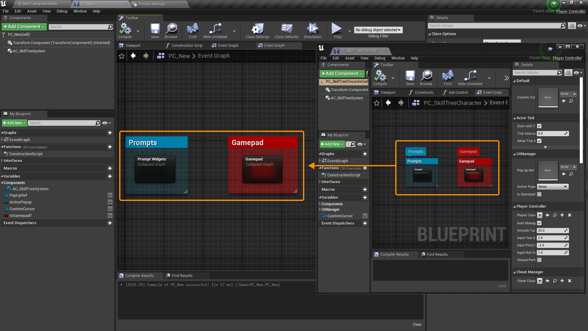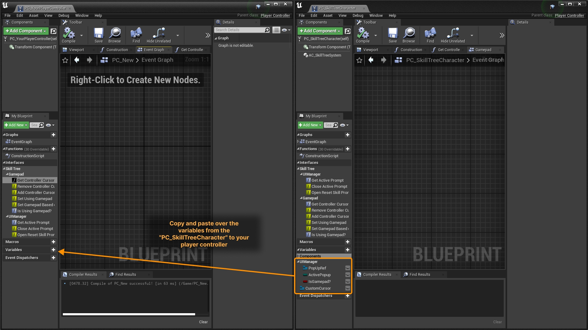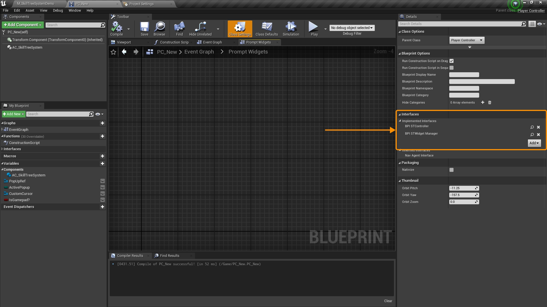 After adding these interfaces, copy over the 2 graphs from the "PC_SkillTreeCharacter" (Path: SkillTreeSystem/Blueprints/PC_SkillTreeCharacter) to your player controller.
