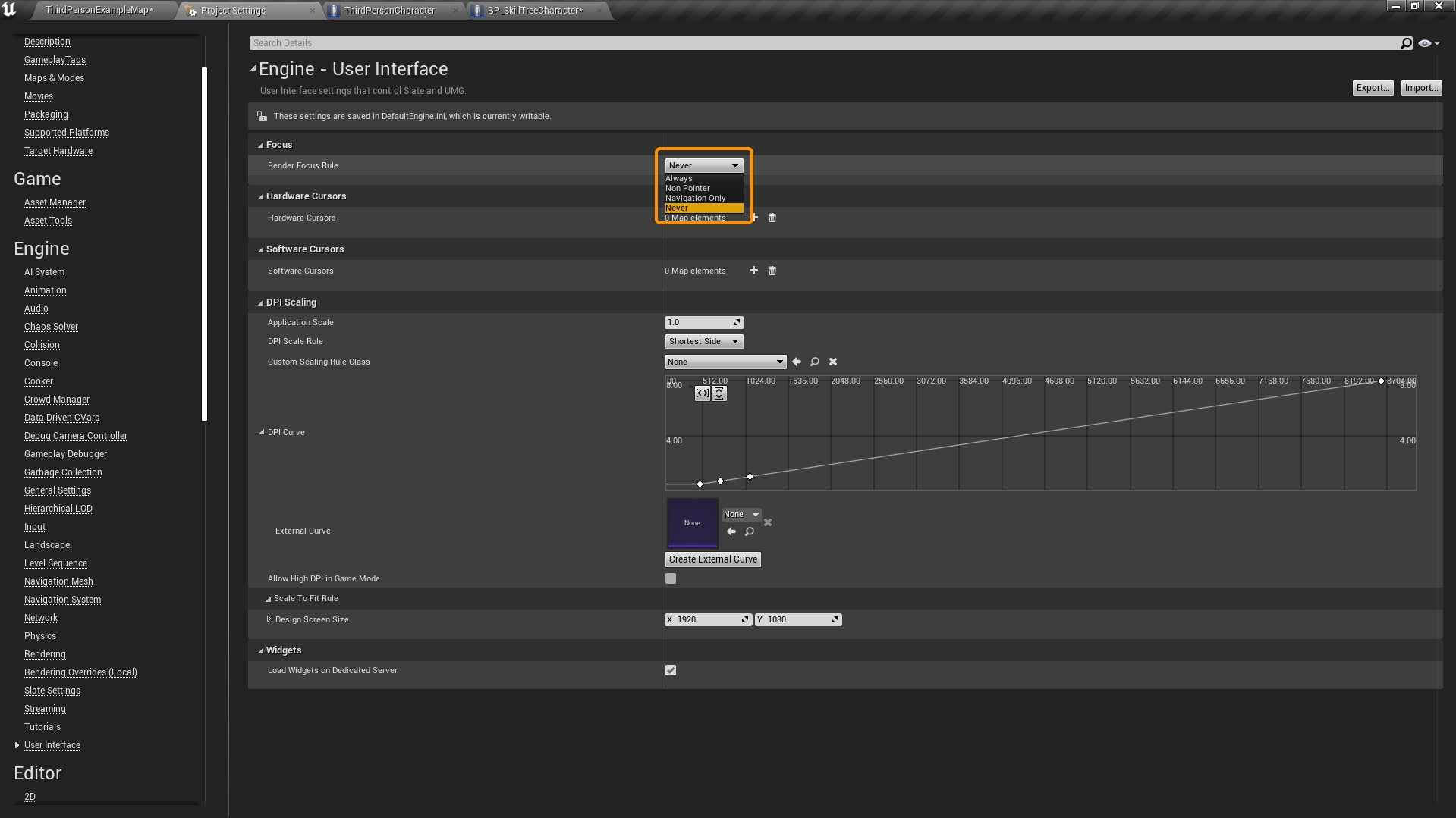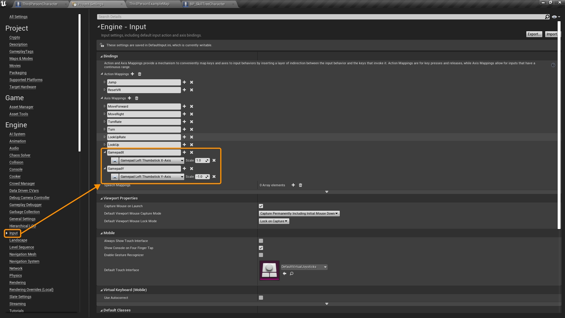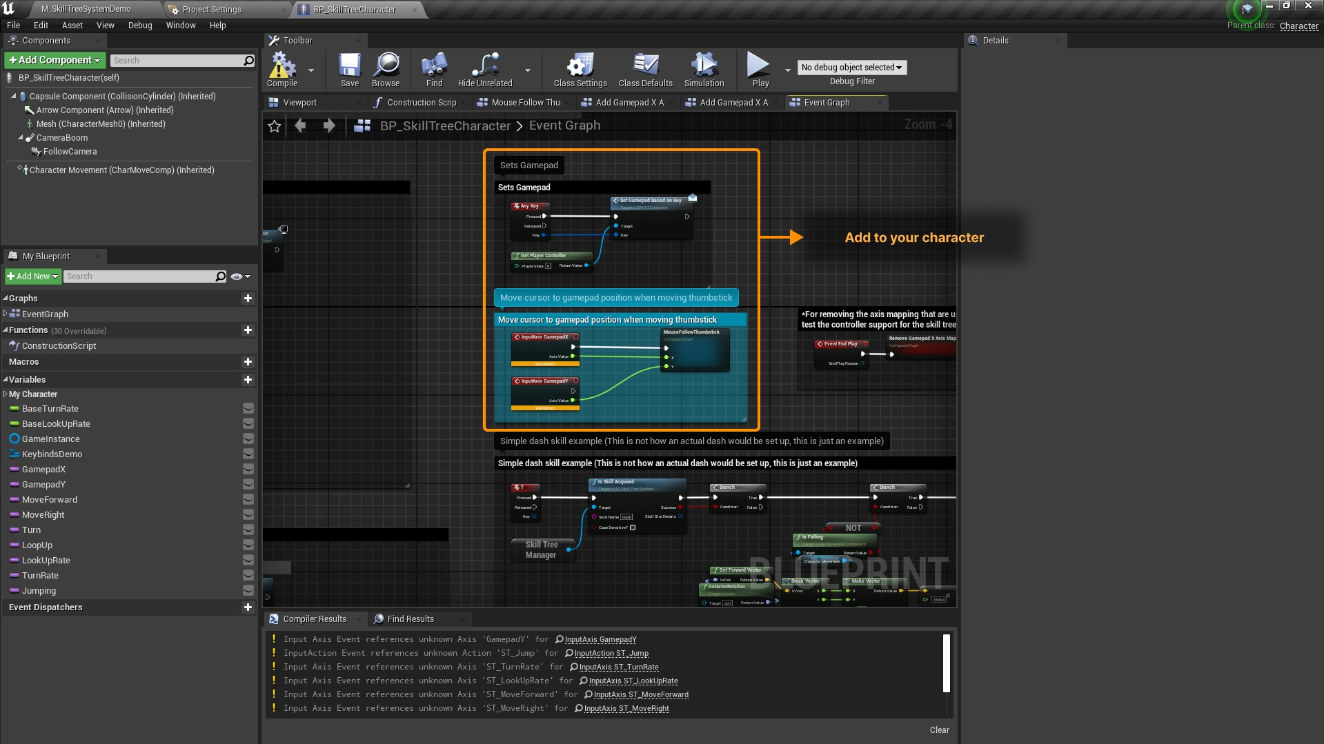 Open BP_SkillTreeCharacter copy these nodes to your existing player blueprint. This will allow the cursor to be moved with the controller. Compile your character blueprint that you have added this to, and if it still gives the yellow warning, make sure you are calling the input event that you set up in the previous step (Right click and search for the axis event you created, then connect it to the graph)