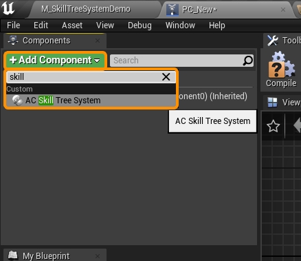 Open your player controller and add the "AC_SkillTreeSystem" component.