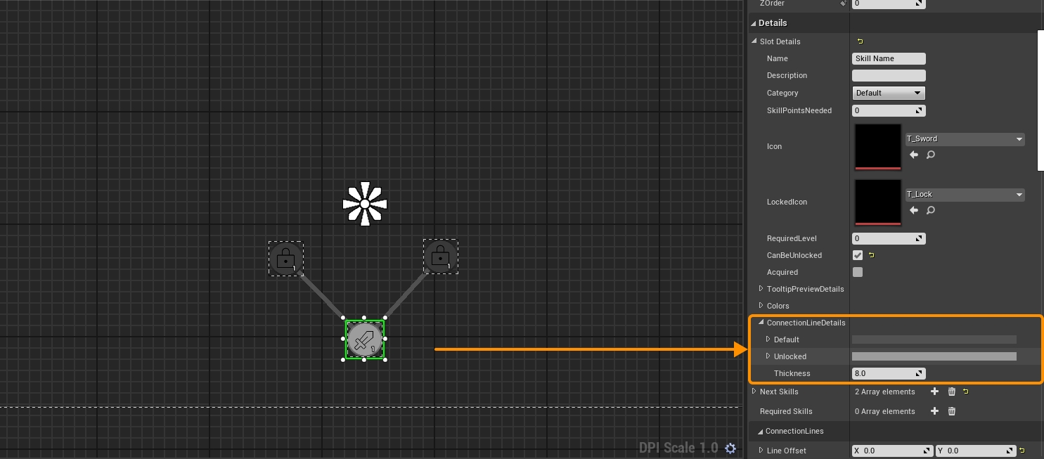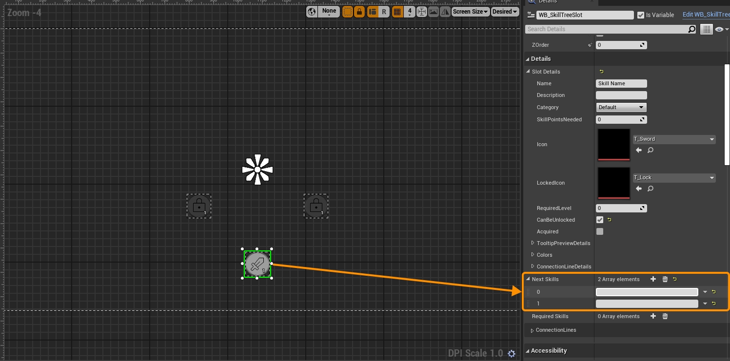 To add dynamic lines, select the skill you want to define as the unlocker for other skills. Add elements to the NextSkills array, in this case, I want to add 2 elements because I am connecting 2 skills.
