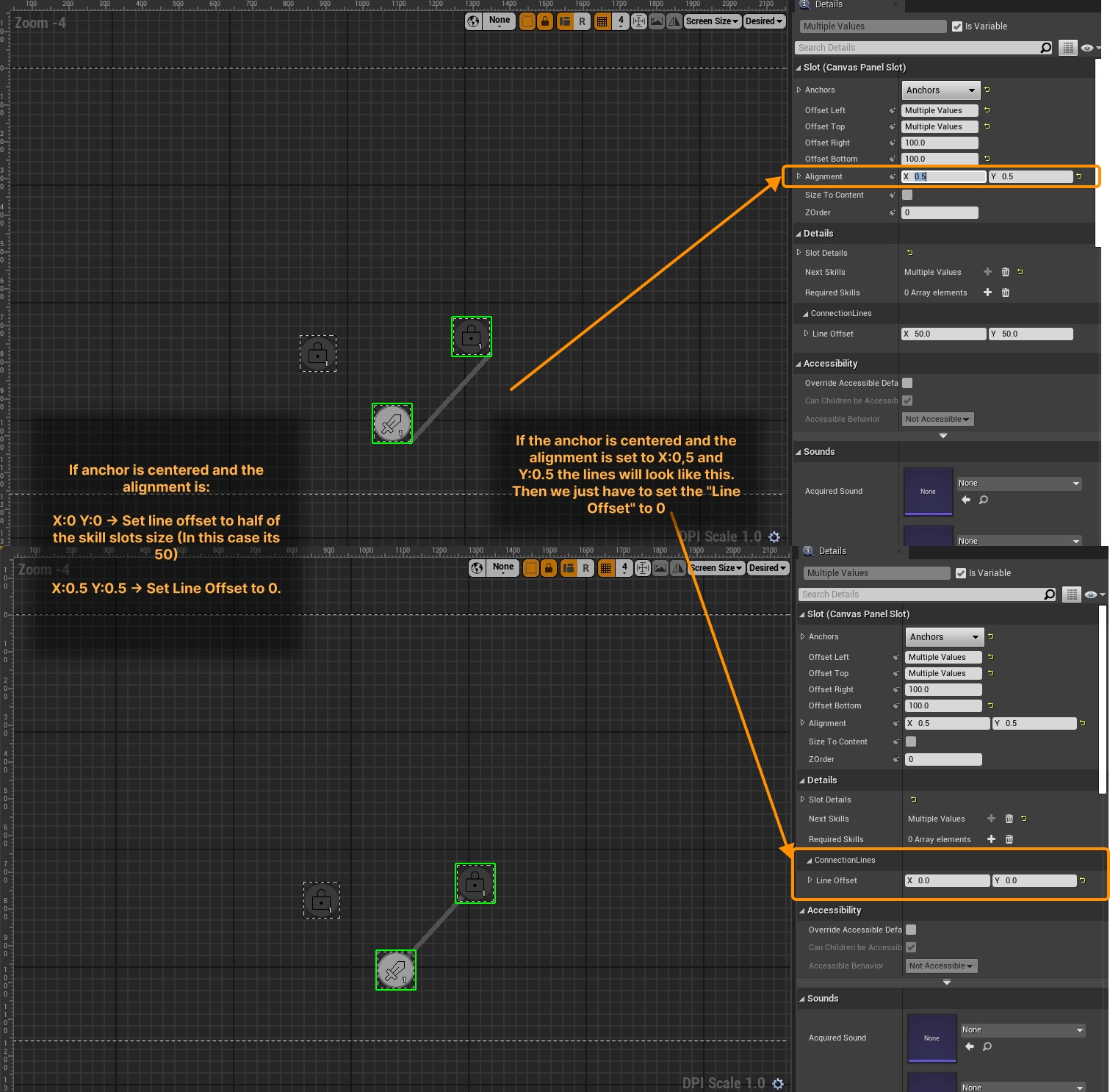Recommendations: Set the anchor to center and apply the following logic If the alignment is: X:0 Y:0 -> Set the Line Offset to half of the Skill Tree Slot's Size (In this case its X:50 Y:50) X:0.5 Y:0.5 -> Set the Line Offset to 0 If you adjust the size of the node when your slot is anchored to the center and alignment is X:0 Y:0 then you need to remember to adjust the Line Offset to half of the size of the of the skill slot.
